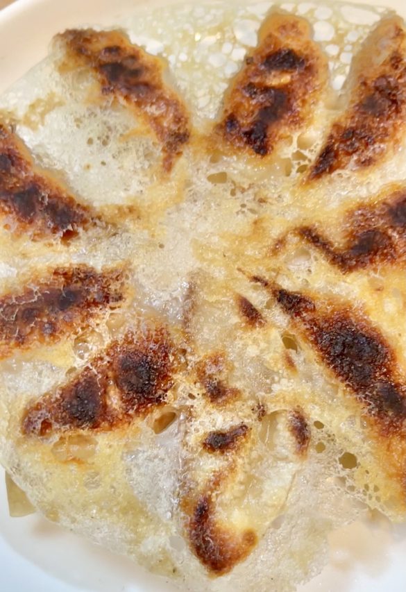 Here’s a fun way to serve dumplings! A thin layer of dumpling lace or “dumpling skirt” is created by adding a mixture of cornstarch and water slurry to the pan while pan frying the dumplings. When the liquid is evaporated, you’re left with a thin, crispy layer around the dumplings. Serve this at your next gathering as it will be a crowd pleaser!