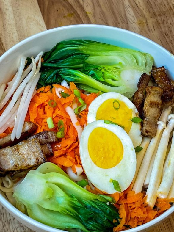 Ramen Noodles with Gochujang and Miso Broth topped with pork belly, egg and vegetables. So yummy and comforting!