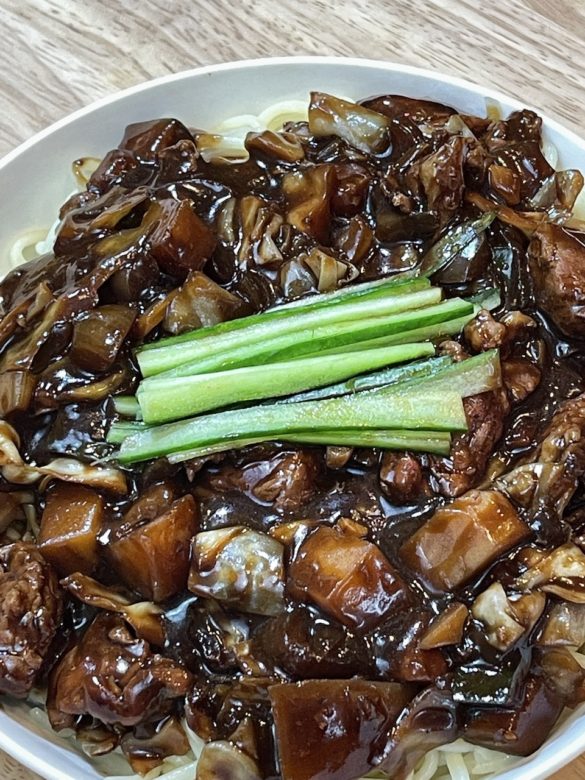 As long as you have the black bean paste, found in Asian markets or online, it’s pretty simple to make at home with meat and vegetables. The salty and slightly sweet black paste (chunjang) is made with wheat flour, soybeans and caramel sauce.