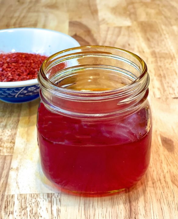 This Korean version includes sliced garlic, ginger, green onions, and shallots with gochugaru (Korean chili pepper flakes) infused in oil. Slicing the aromatics releases more flavor to the oil. This chili oil is also clear and doesn’t include the chili pepper flakes but feel free to add it without straining if you prefer.