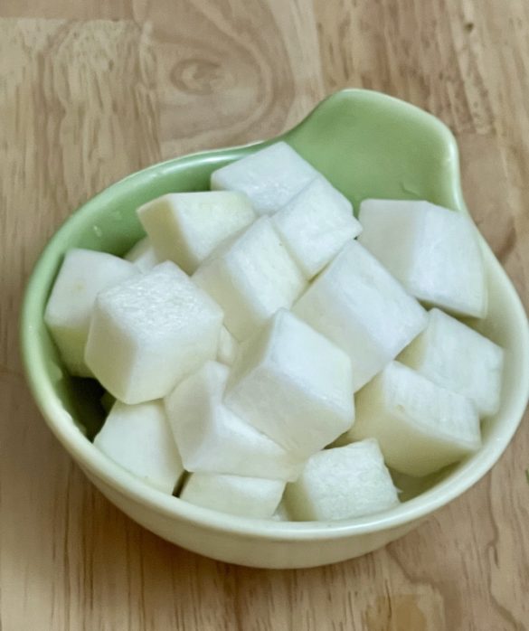 When you order Korean fried chicken at a restaurant, they’re usually served with a side of pickled radish. This crunchy radish is sweet and tangy and pairs perfectly with fried chicken.