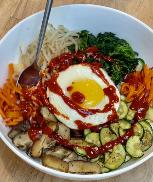 Sauce Soybean sprouts- Boil sprouts in salted water for 3-4 minutes until soft. Rinse in cold water and drain ( Don’t drain the cooking water). Place in a bowl and mix with 1 tablespoon sesame oil, 1-2 teaspoons minced garlic, 1 teaspoon sesame seeds, and salt and pepper to taste. Spinach: In the same pot, Boil ( blanch) the spinach for about 30 seconds. Rinse in cold water and squeeze out the water. Place in a bowl and cut into a few pieces. Mix with with 1 teaspoon sesame oil, 1 teaspoon minced garlic, 1/2 teaspoon sesame seeds and salt and pepper to taste. Carrots: Heat oil in a pan. Sauté with a pinch of salt and pepper for 2-3 minutes or until tender. Set aside. Zucchini: Heat oil in a pan ( I used sesame oil for this one). Sauté with some garlic and pinch of salt and pepper for about 2 minutes or until soft. Set aside. Mushrooms: Heat oil in a pan. Sauté with a pinch of salt and pepper for about 1 minute or until soft. Set aside. ( Feel free to add garlic to other vegetables. such as zucchini) Make the sauce: Mix all ingredients together in a bowl. Taste and adjust seasonings to your taste . To assemble: Add hot rice to a large bowl. Top with assorted vegetables. Fry an egg -sunny side up or based on preference and place on top of vegetables. Drizzle with sauce and some sesame oil and mix together. You can also add kimchi if you have some for the perfect bite!